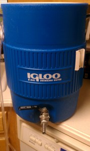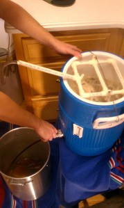 Once your strike water boils you should pour it into the cooler bucket and let it cool to approximately 175 degrees Fahrenheit (these instructions will vary slightly for different brews). From now on I’ll refer to the cooler bucket as the “mashtun.” There’s a decent amount of jargon here, which I personally enjoy but for n00bs, I’ll supply vocabulary and definitions as we go along. A mashtun (pronounced mash-ton) is precisely what it sounds like. It’s a container for mashing. Russell modified an igloo tap cooler for his mashing purposes. He removed the plastic tap and replaced it with a stainless steel ball valve. It’s important to use as many stainless steel parts as possible when making consumables. Parts made of brass or other metals can contain lead and other harmful substances that could leach into your brew.