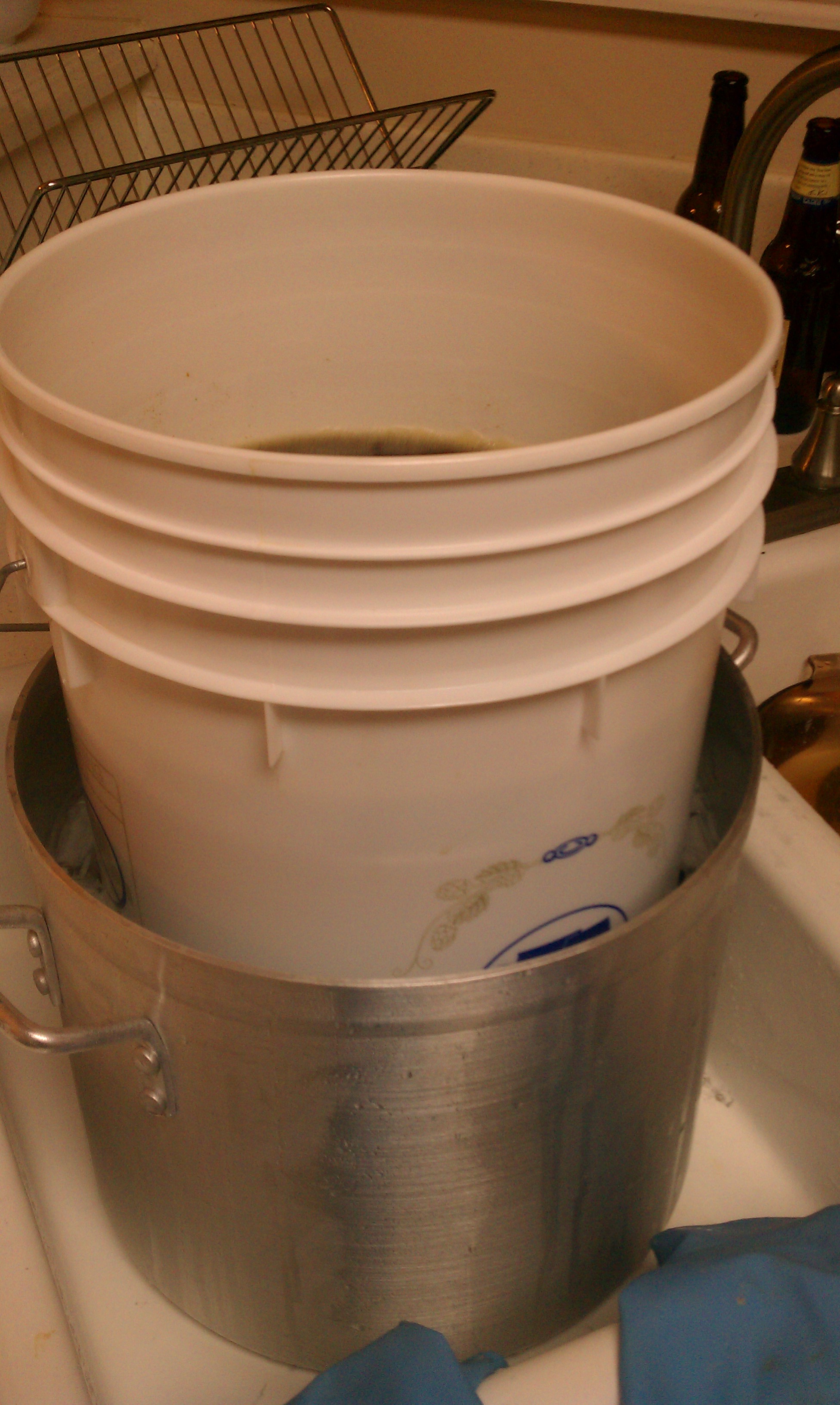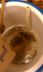 This entire process hinges on the abilities of our little bacterial yeast friends to convert sugars into alcohol. All you have to do to get them started on their noble work is dump them in the bucket. Next just put the top on your fermentation bucket, seal it up, put it in a cool, dark place in your house and forget about it for a couple of weeks. For Berry’s Summer Brown Ale, the initial fermentation time is approximately 21 days, however this time will vary for different types of brews. We made a trappist ale the other night and it has to ferment for approximately two to three months before it’s ready for bottling. Also, when sealing up your brew to ferment, it’s important to have a gas valve on the top of the bucket. I’m not sure if the gas created by the fermenting yeast will build up enough pressure to pop the top off of your fermentation bucket, but it’s something I’d rather not bet on. They sell the gas valves at home brewing shops for very little money. It’s definitely worth the few dollars to buy one. The valve should just be inserted into the little hole in the bucket top made just for this purpose.