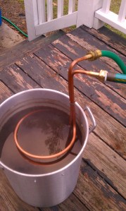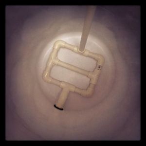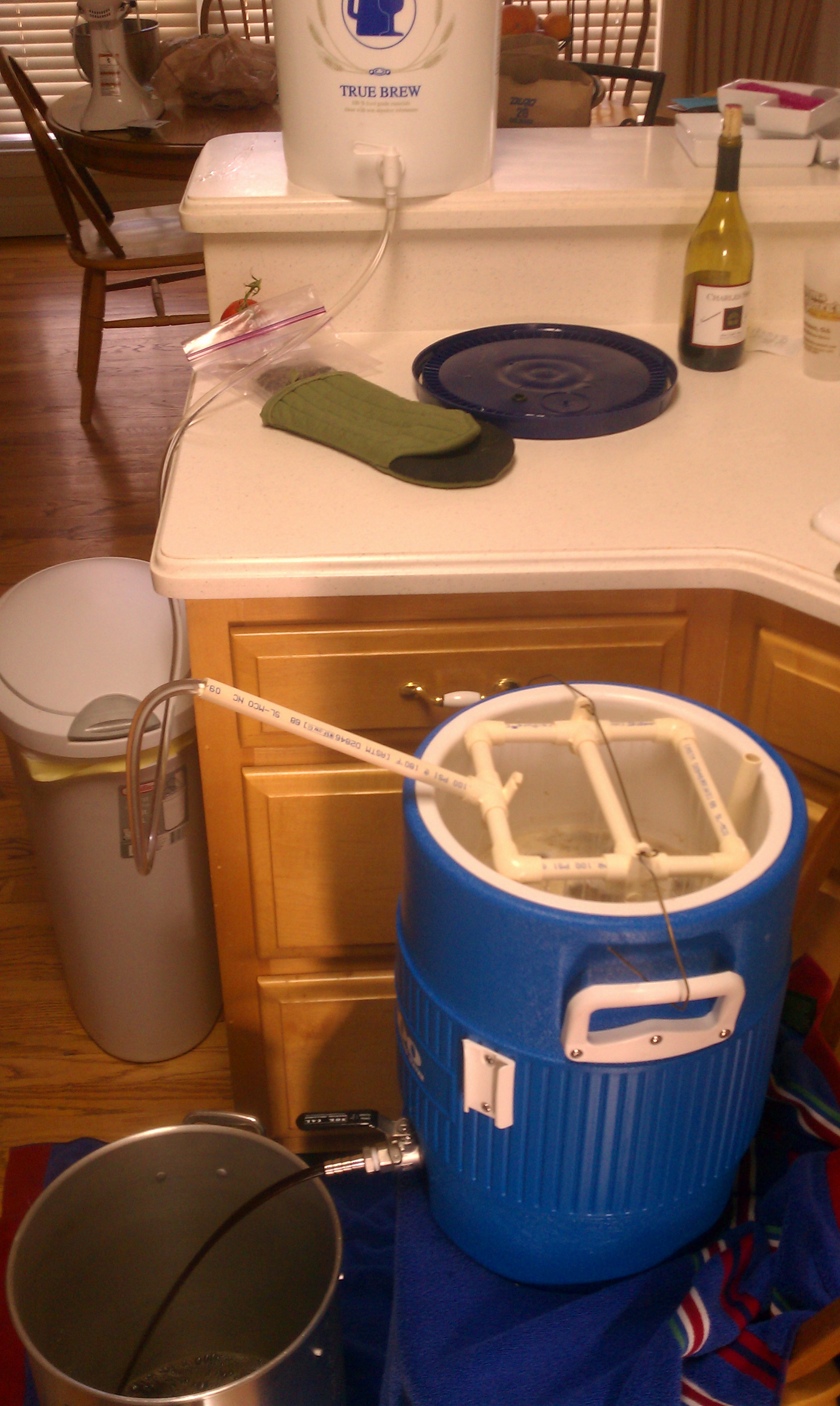 Sparging is the process of trickling hot water through your mashtun for the purpose of extracting the wort. We used an apparatus called a “fly sparge.” It’s similar in construction to the false bottom. Russell made his fly sparge out of the same drinking-water-grade cpvc piping but instead of slits, it has holes drilled in it at intervals to allow the water to trickle evenly through the mash. You need to evenly trickle the water, or the “hot liquor” to use the brewing vernacular, so that you get all that your mash has to offer. In the picture to the left, you can see our whole setup. The hot liquor tank is at the top. It drains into the fly sparge, which trickles the hot liquor down over the mash and through the mashtun false-bottom where the wort drains out into the boil pot for the next stage of brewing.