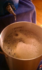 Next, boil some water. The water you boil is called “strike” water. The strike water is water that is initially mixed with malted grains to form a “mash,” which is just a mixture of cracked grains and boiling water. Simple! Basically we’re just making tea out of hops and grains.