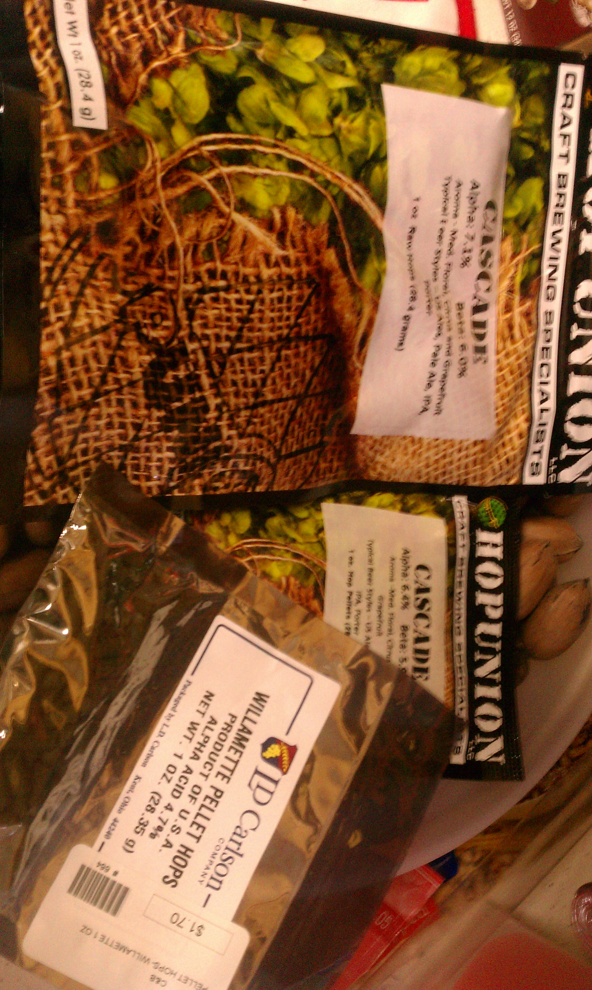 We added one full ounce of cascade leafy hops at the very beginning of the 60 minutes. With 15 minutes to go, we added another full ounce of the leafy cascade hops as well as a tablespoon of Irish moss for clarity. At five minutes left  we added the orange zest. And finally, at zero minutes we added the willamette pellet hops for added aroma.