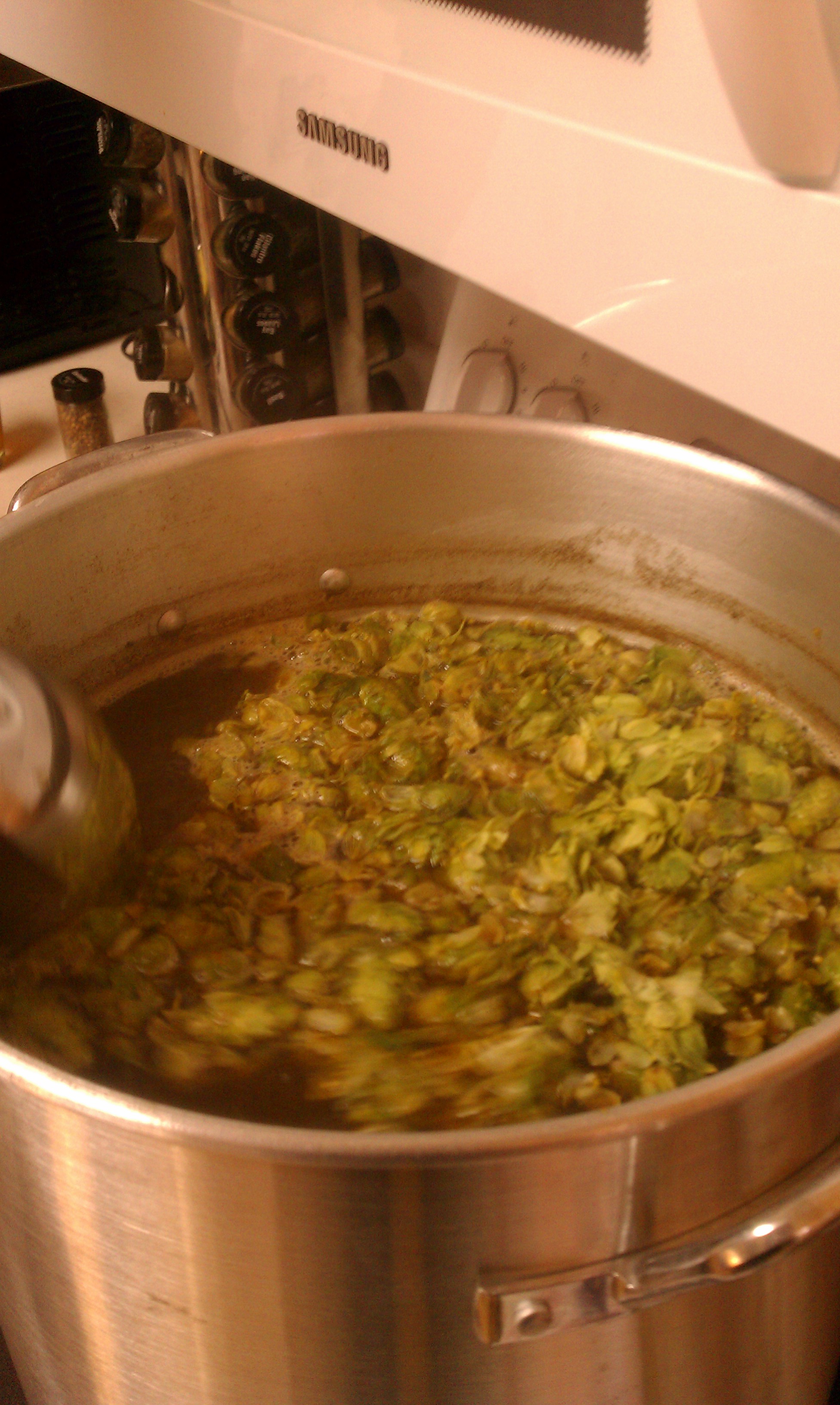 The process of draining the wort creates quite a froth, so I recommend spooning-off this foam before the brew really starts to boil. We boiled the wort for 60 minutes. (*Note: You have to be vigilant during this process otherwise your brew could boil over spilling precious beer and making a huge mess. I recommend stirring every five minutes or so. Also, try not to always stir in the same direction. Mix it up and do figure eights through the center of the liquid. Stirring in one, constant direction creates sort of an “eye of the storm” if you will–neutral zone inside the whirlpool created by your stirring that will allow boiling hot liquid to shoot up and splatter everywhere. Just pay attention, stir when you see your brew starting to bubble up a lot and try not to burn yourself.)